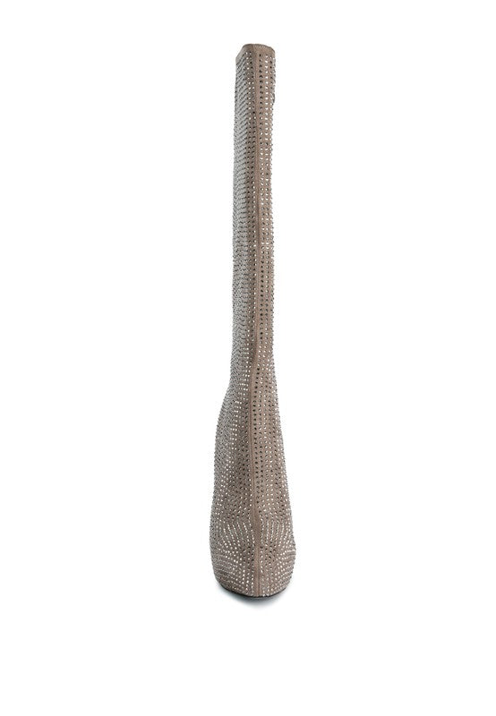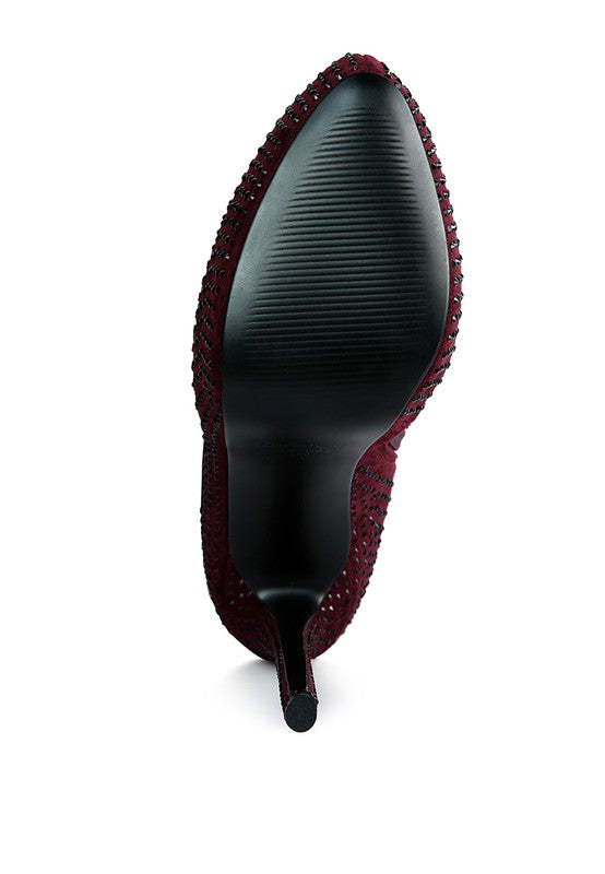 Outshine them all, the rhinestone embellished boots are drop dead gorgeous with platform heel elevation and the bold look of the stiletto heels. These are the perfect party shoes and would also be a dazzling pair with a bridal outfits or wedding heels for winter weddings.